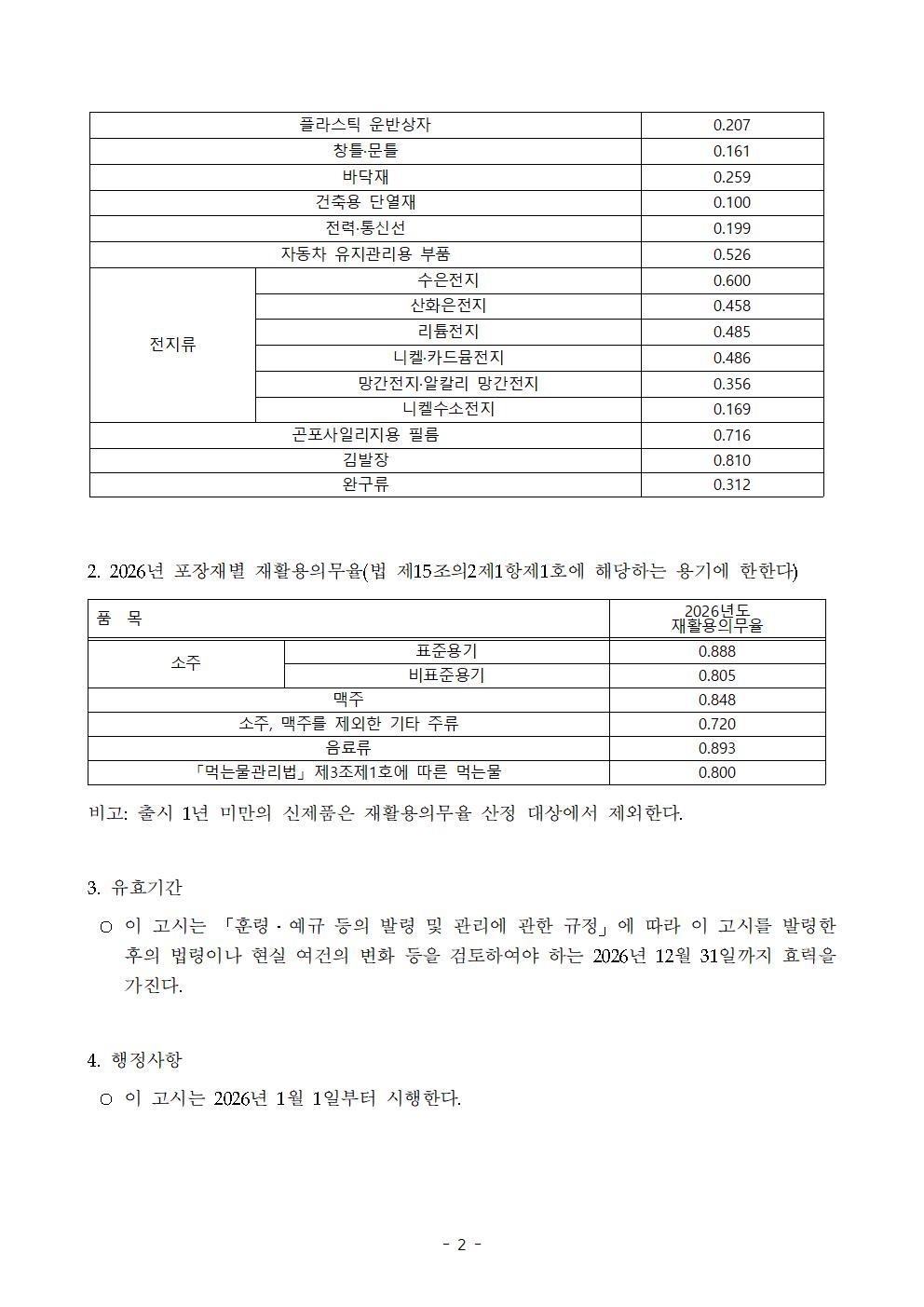 공지 2026년 제품 · 포장재별 재활용의무율 고시 제정[안]